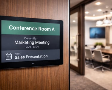 Mit unserer digitalen Beschilderung präsentieren Sie Informationen zeitgemäß, aufmerksamkeitsstark und flexibel. Ob Begrüßungsscreens, Raumnummern, Raumbelegungen oder Info-Displays – Inhalte lassen sich übersichtlich und professionell darstellen und jederzeit anpassen.